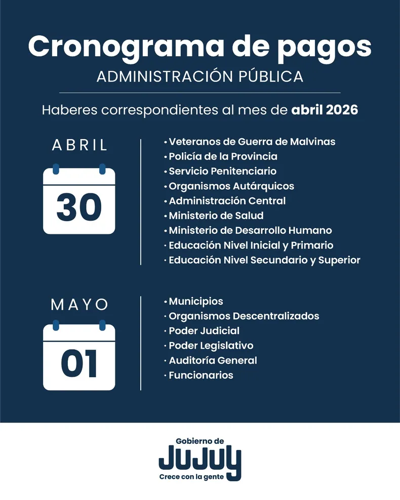 Es importante recordar que el pasado viernes 17 de abril, el Gobierno de Jujuy ya hizo efectivo el pago de un bono extraordinario de $100.000 por persona. Este beneficio, establecido mediante la Circular N° 014 C.P./2026, se liquidó como un suplemento no remunerativo por única vez, por lo que no forma parte del salario básico ni impacta en otros conceptos salariales que se perciben en este cronograma de mayo.