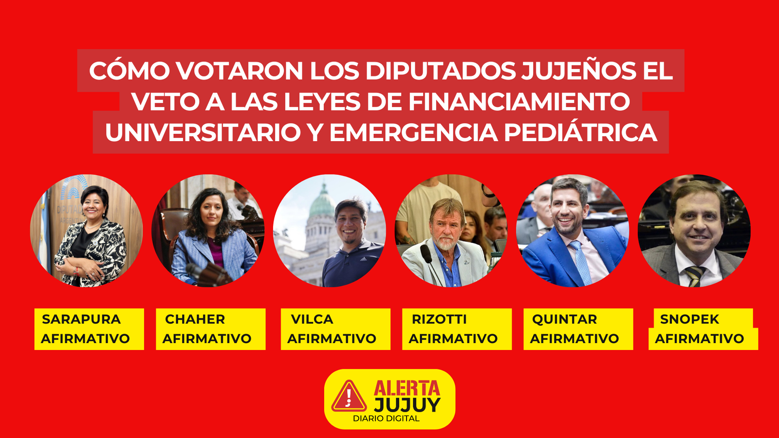 ALERTA JUJUY – En el día de ayer la Cámara de Diputados de la Nación rechazó los vetos presidenciales a las leyes de financiamiento universitario y emergencia pediátrica. De los seis diputados que representan a la provincia de Jujuy, cinco votaron en contra de la postura del Gobierno, mientras que solo el legislador oficialista Manuel Quintar apoyó el veto.