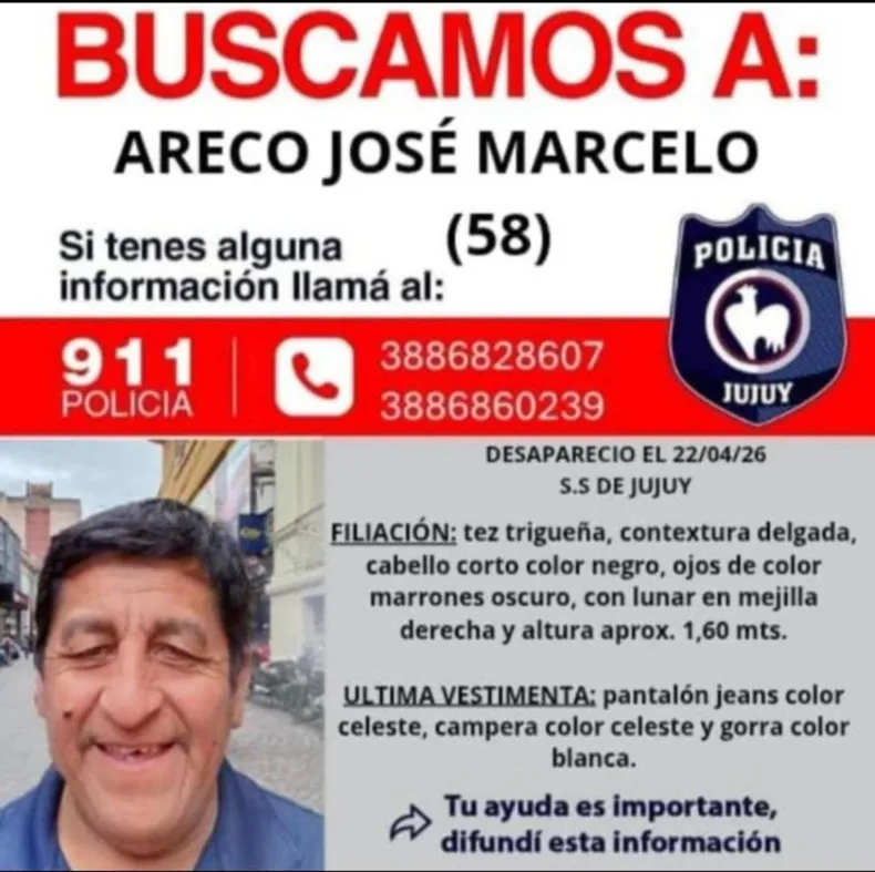 ALERTA JUJUY – La comunidad jujeña se encuentra movilizada tras la desaparición de José Marcelo Areco, un hombre de 58 años de quien no se tiene información desde el pasado jueves 23 de abril. Su familia ha iniciado una búsqueda desesperada y solicita la colaboración de la sociedad para obtener cualquier dato que permita localizarlo, ya que se encuentra ausente de su hogar desde hace cinco días.