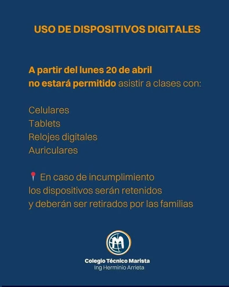 Las autoridades escolares advirtieron que la medida será de cumplimiento efectivo. En caso de que un alumno sea detectado con alguno de estos elementos, el dispositivo será retenido por la institución y solo podrá ser retirado por los padres o tutores legales del estudiante.